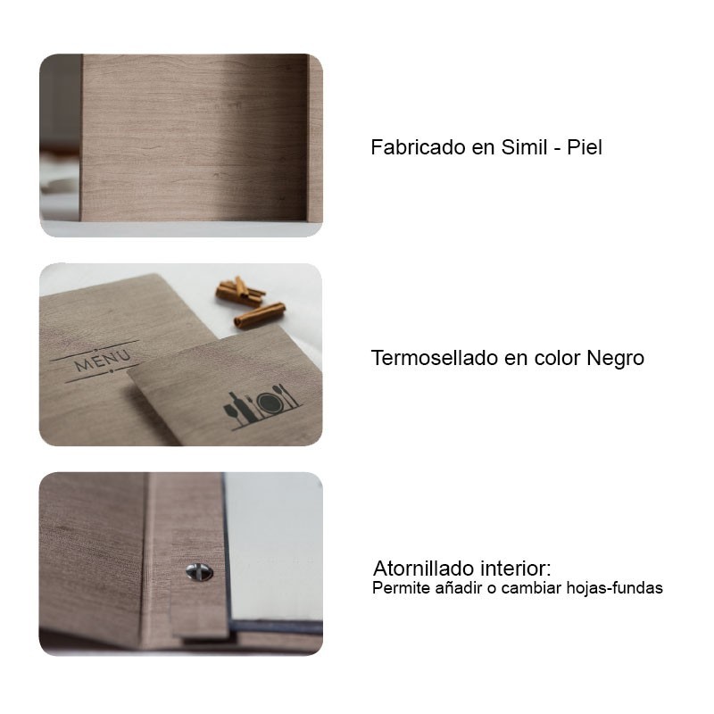 3 Fundas de PVC piel de naranja, flexibles, duraderas y altamente resistentes, sujetas mediante atornillado interior que permite añadir o cambiar hojas o fundas según la necesidad del cliente.