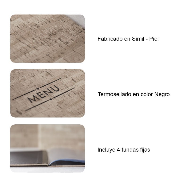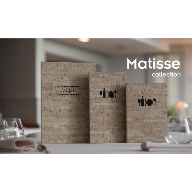 Portamenús colección Matisse fabricados en simil piel con termosellado en color negro y fundas fijas de PVC. Ideal para hostelería y restauración. Tamaño a elegir.