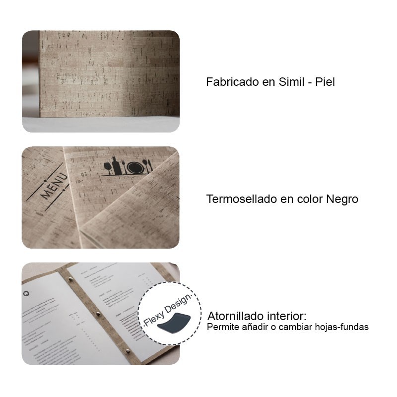 3 Fundas de PVC piel de naranja, flexibles, duraderas y altamente resistentes, sujetas mediante atornillado interior que permite añadir o cambiar hojas o fundas según la necesidad del cliente.
