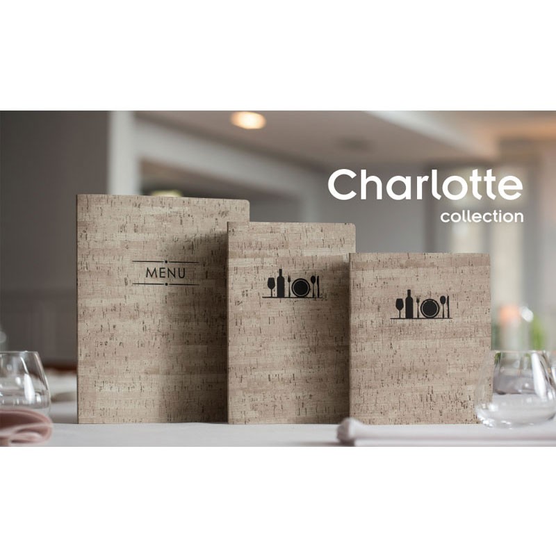Portamenús colección Charlotte fabricados en simil piel flexible con termosellado en color negro y fundas de PVC con atornillado interior. Ideal para hostelería y restauración. Tamaño a elegir.