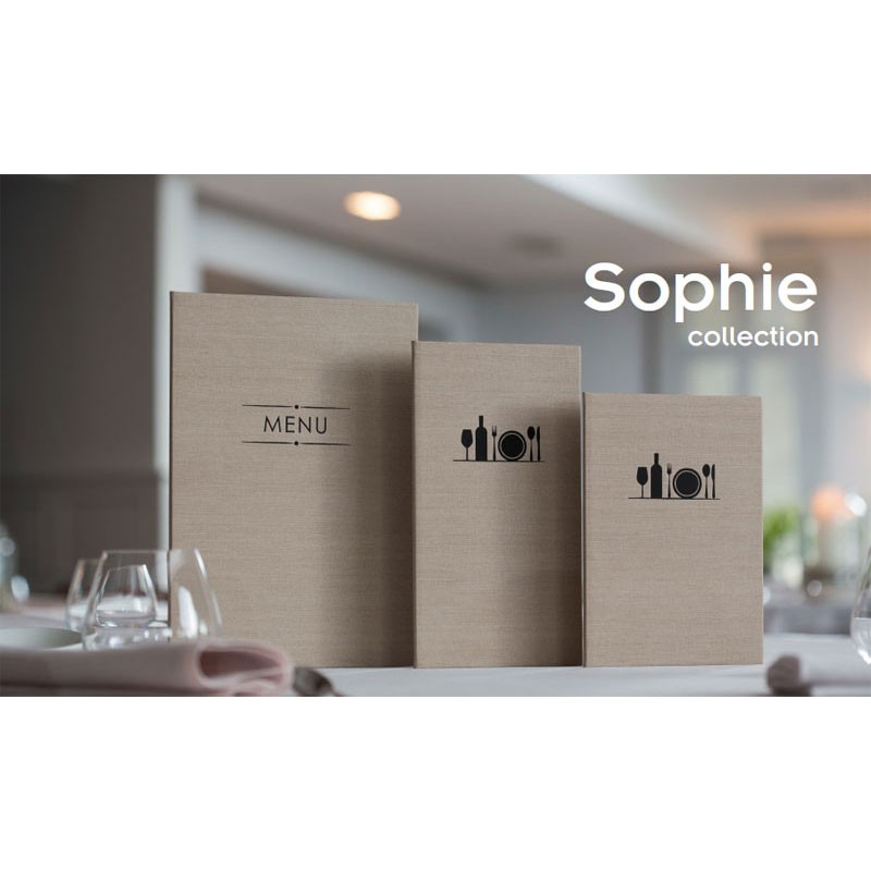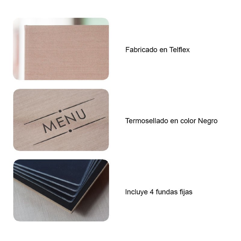 Portamenús colección Sophie fabricados en Telflex con termosellado en color negro y fundas fijas de PVC. Ideal para hostelería y restauración. Tamaño a elegir.