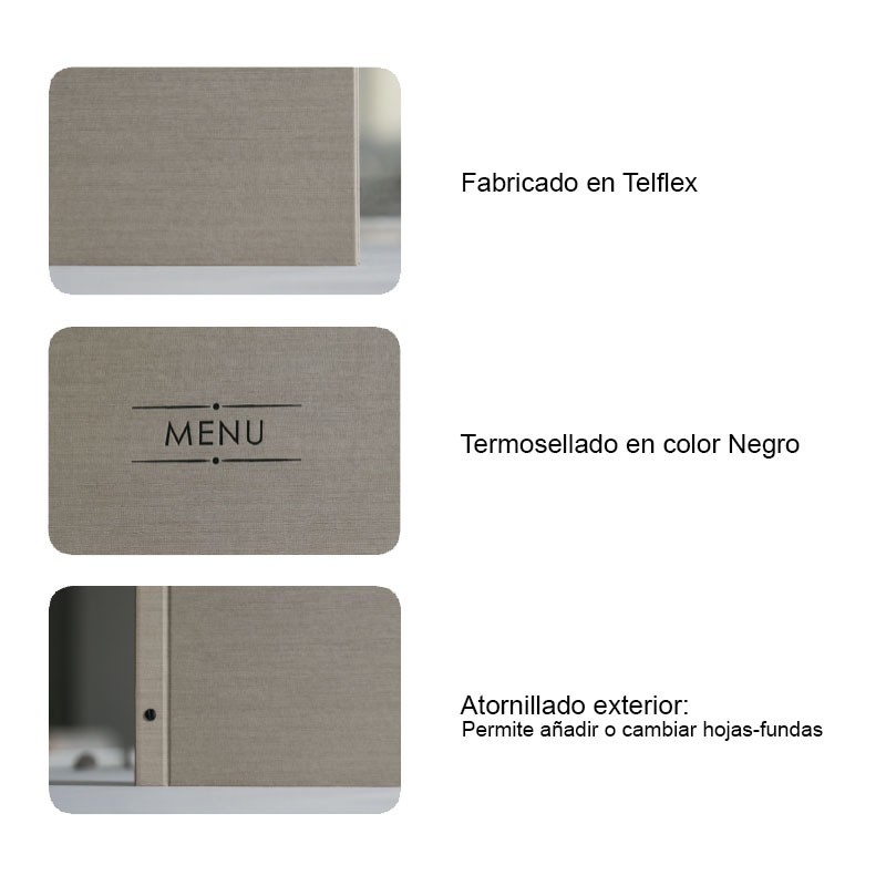 3 Fundas de PVC piel de naranja, flexibles, duraderas y altamente resistentes, sujetas mediante atornillado exterior que permite añadir o cambiar hojas o fundas según la necesidad del cliente.