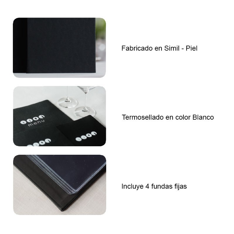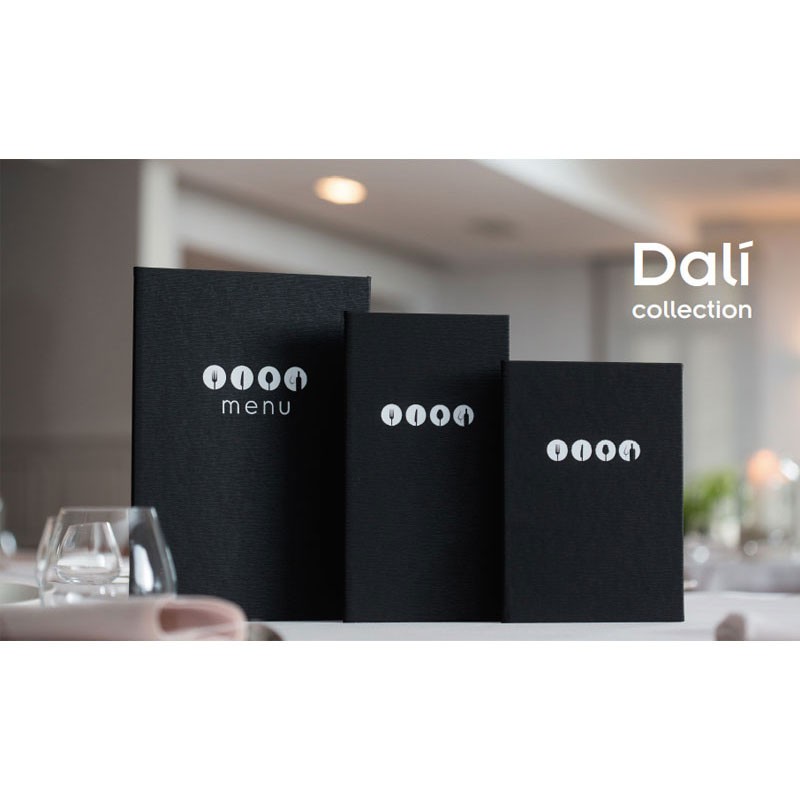Portamenús colección Dalí fabricados en simil piel con termosellado en color blanco y fundas fijas de PVC. Ideal para hostelería y restauración. Tamaño a elegir.