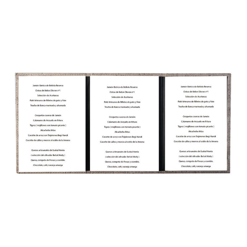 Portamenús colección Marcel fabricados en simil piel con termosellado en color negro y 3 solapas transparentes. Ideal para hostelería y restauración. Tamaño A5: 17x24 cm.