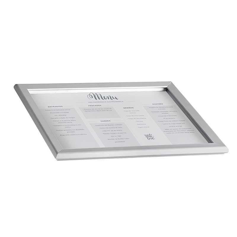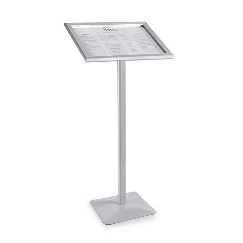 Porta menú tamaño A3 con soporte de aluminio. Marco de apertura con un solo click. 2 posibilidades de montaje: atril y pared.