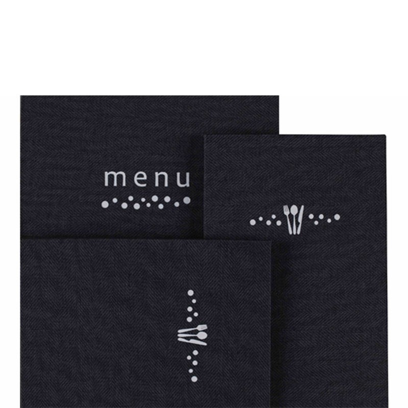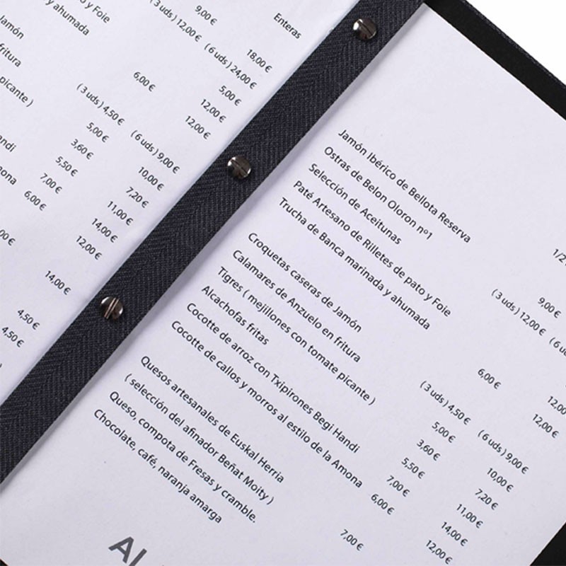 Portamenús colección Pablo fabricados en simil piel con termosellado en color blanco y fundas de PVC con atornillado interior. Ideal para hostelería y restauración. Tamaño a elegir.