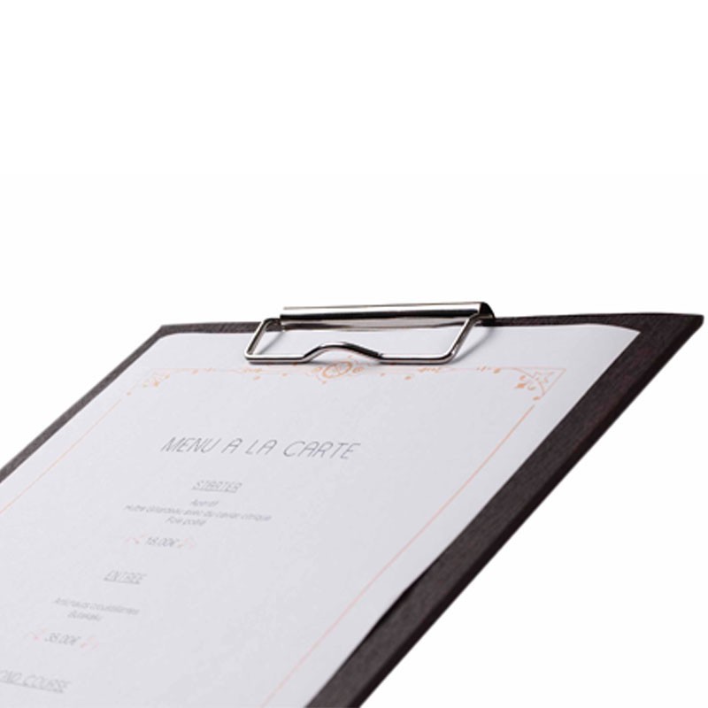 Pinza metálica con acabado plateado para la sujección de la hoja del menú.