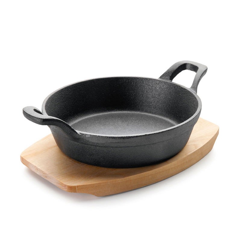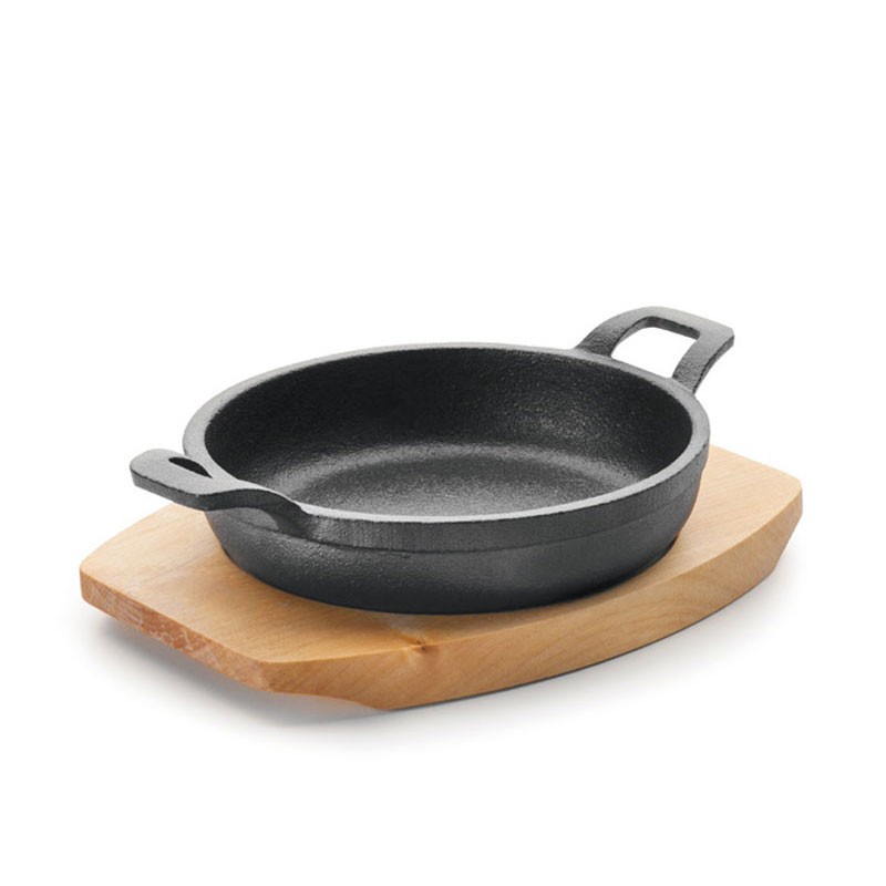 Cacerola redonda para cocina modelo Magma fabricada en hierro fundido en una sóla pieza apta para placas de inducción, eléctricas, vitrocerámicas y cocinas de gas. Incluye base de madera.