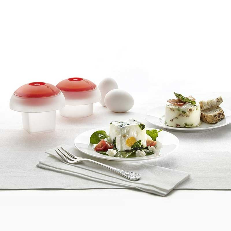 Sus peculiares formas permiten darle forma al huevo para mejorar las presentaciones en el plato. Un set de dos Ovo para cocinar dos huevos con formas distintas, en este caso uno con forma circular y el otro con forma cuadrada, para cambiar cuando más te apetezca o para presentar dos huevos con formas distintas.