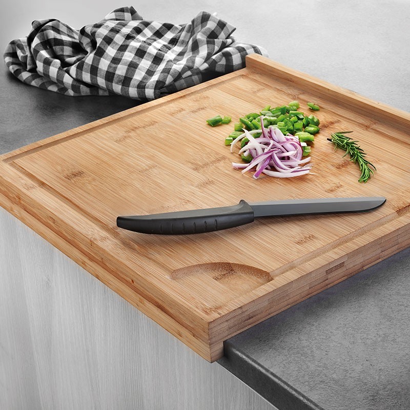 Tabla de corte reversible con topes para encimera fabricada en bambú natural de alta calidad, robusto y resistente. Medidas: 39,5x38x4 cm.