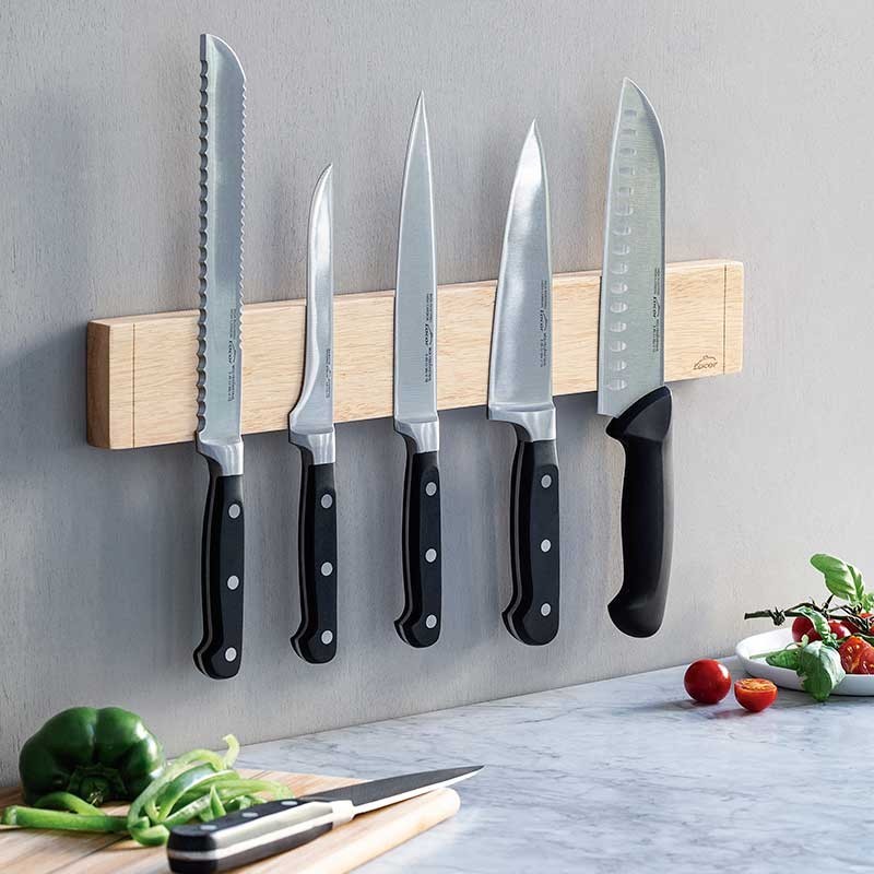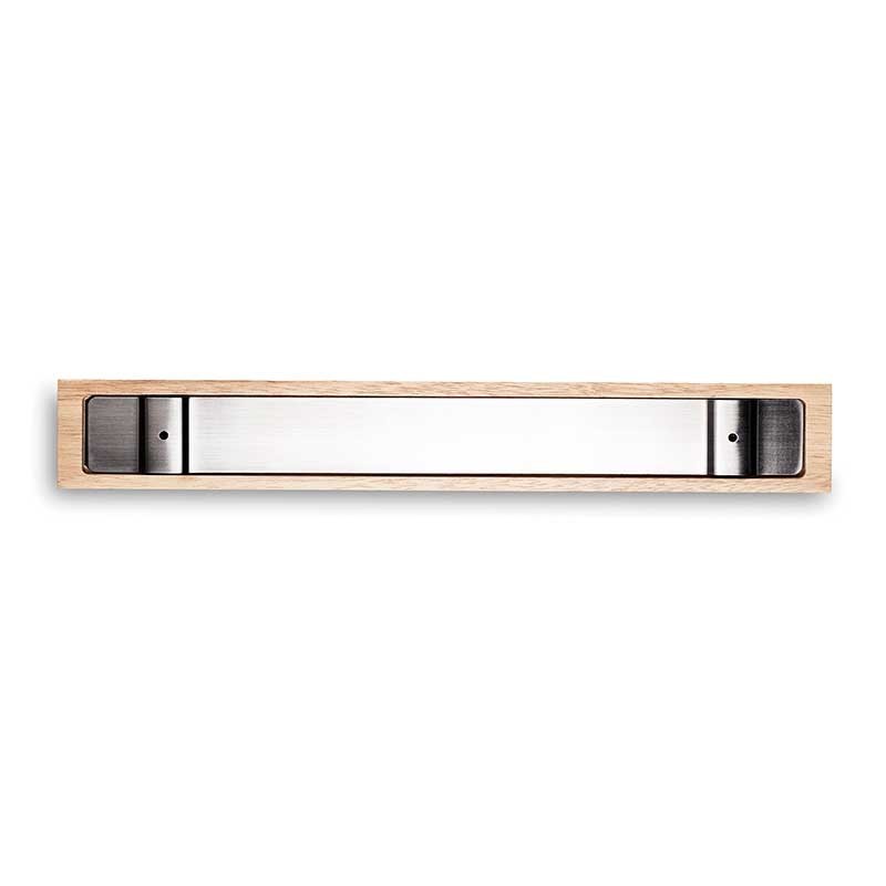 Elegante soporte magnético para cuchillos de cocina fabricado en madera de caucho. Incluye todo lo necesario para su montaje.