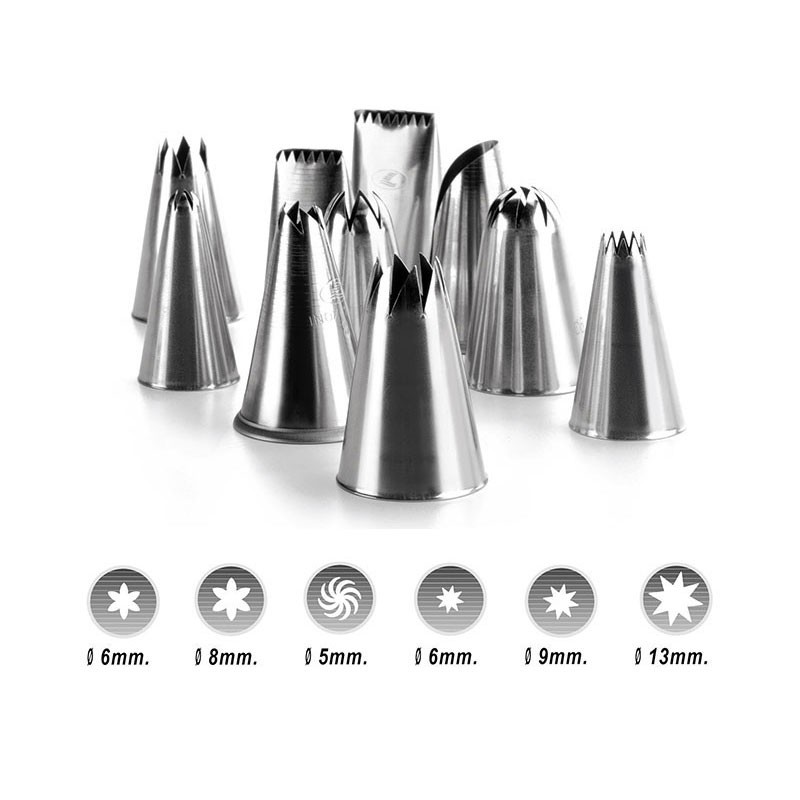 Ampliar Set de 6 boquillas de repostería para manga pastelera con 3 formas variadas y fabricadas en acero inoxidable 18/10 de alta calidad y resistencia a la corrosión.