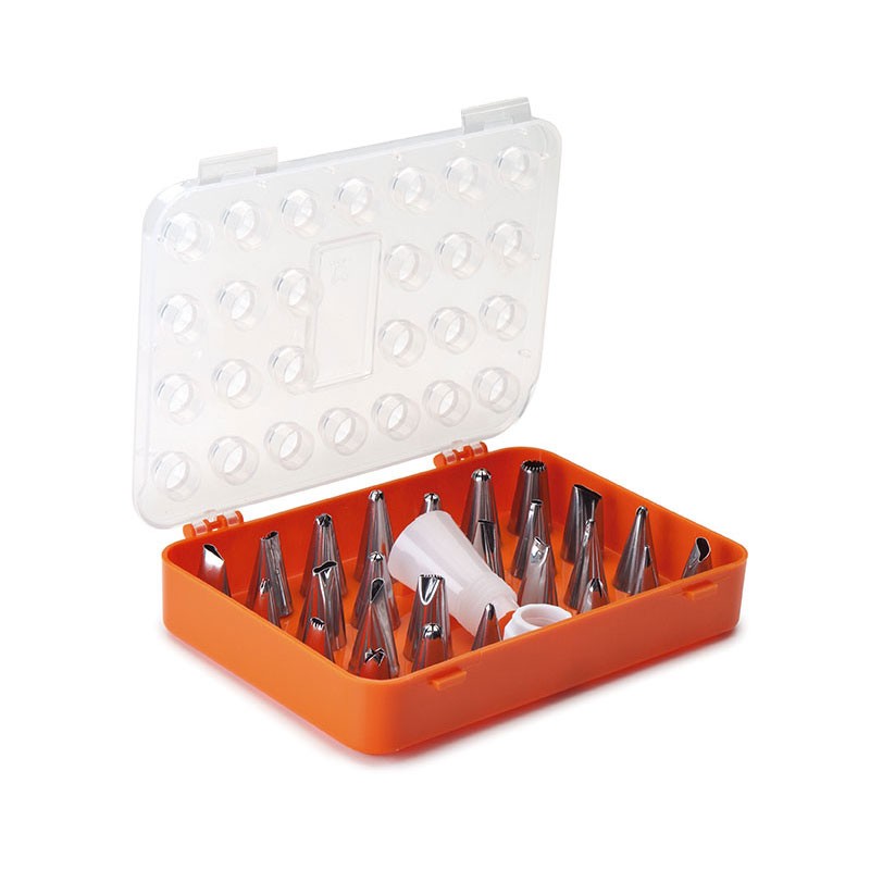 Ampliar Estuche con 26 boquillas de repostería variadas para decorar con manga pastelera, fabricadas en acero inoxidable de gran calidad.