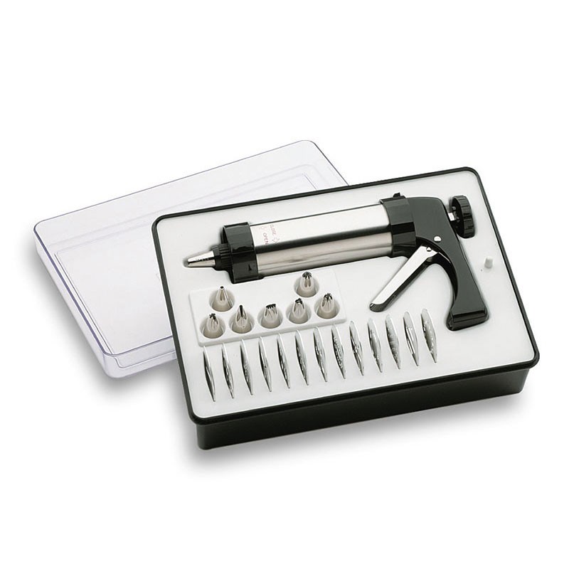 Ampliar Estuche con pistola de 250 ml fabricada en acero inoxidable más set de boquillas y accesorios para decorar o rellenar productos de repostería.