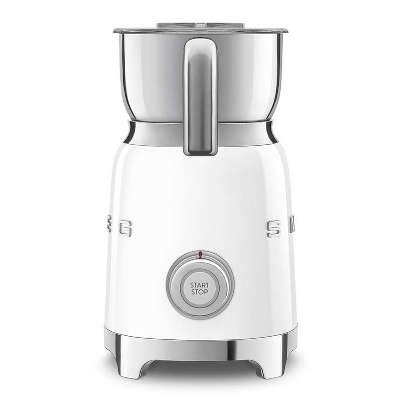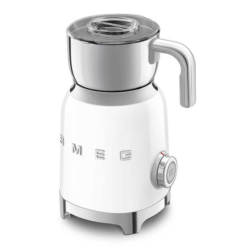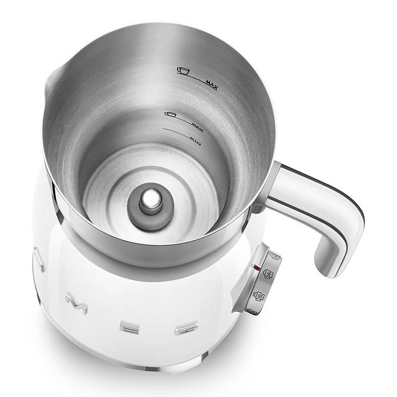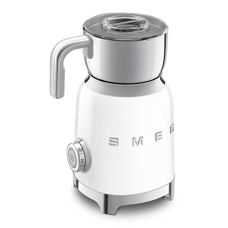 Espumador de leche Smeg 50's Style con cuerpo en acero inoxidable acabado blanco brillo y 6 programas para preparar bebidas calientes o frías con o sin espuma.