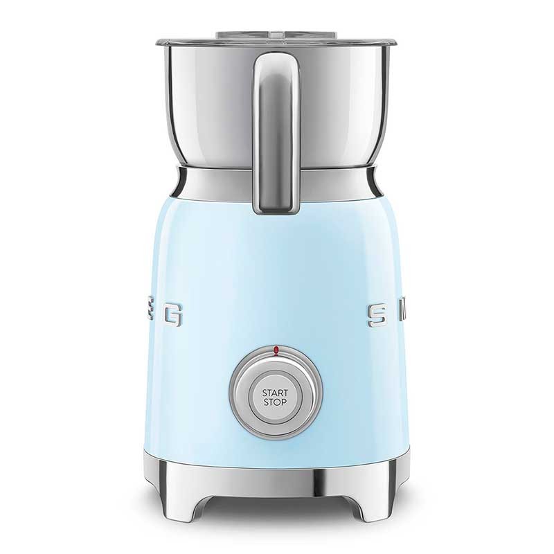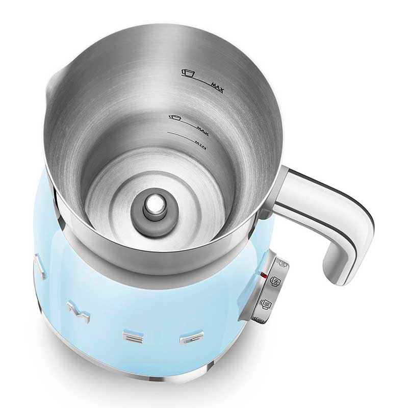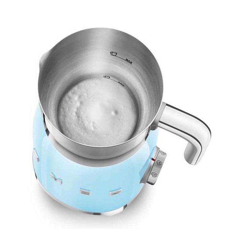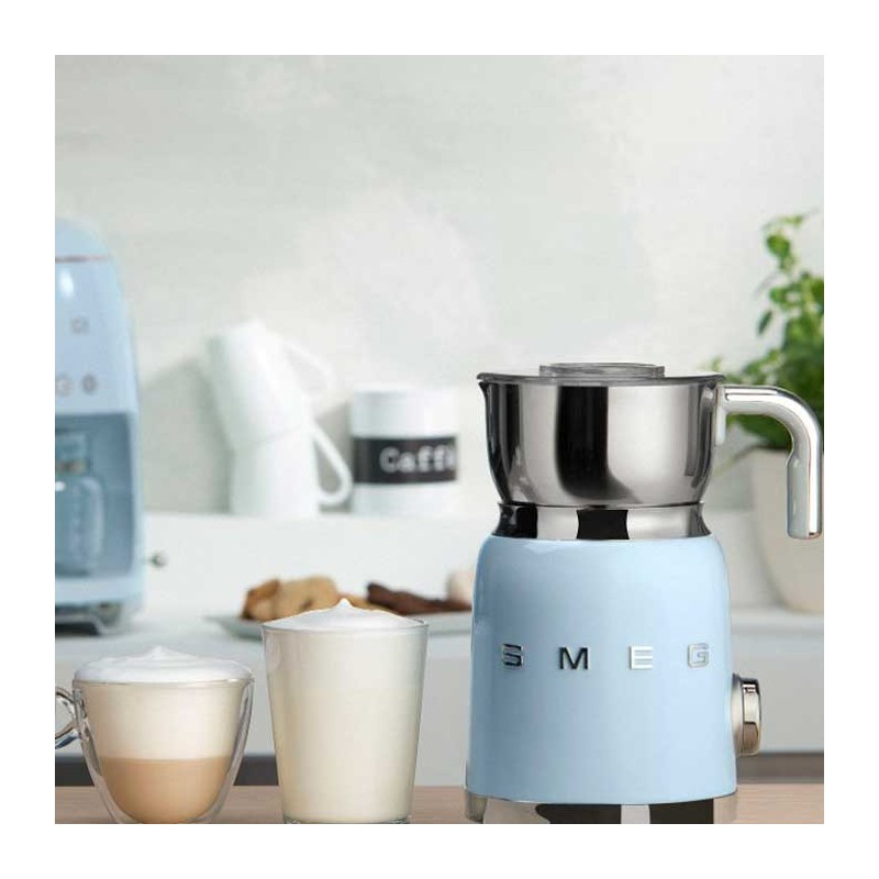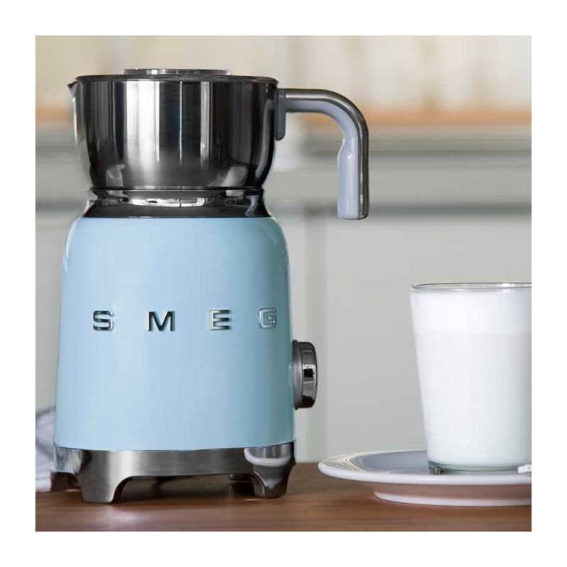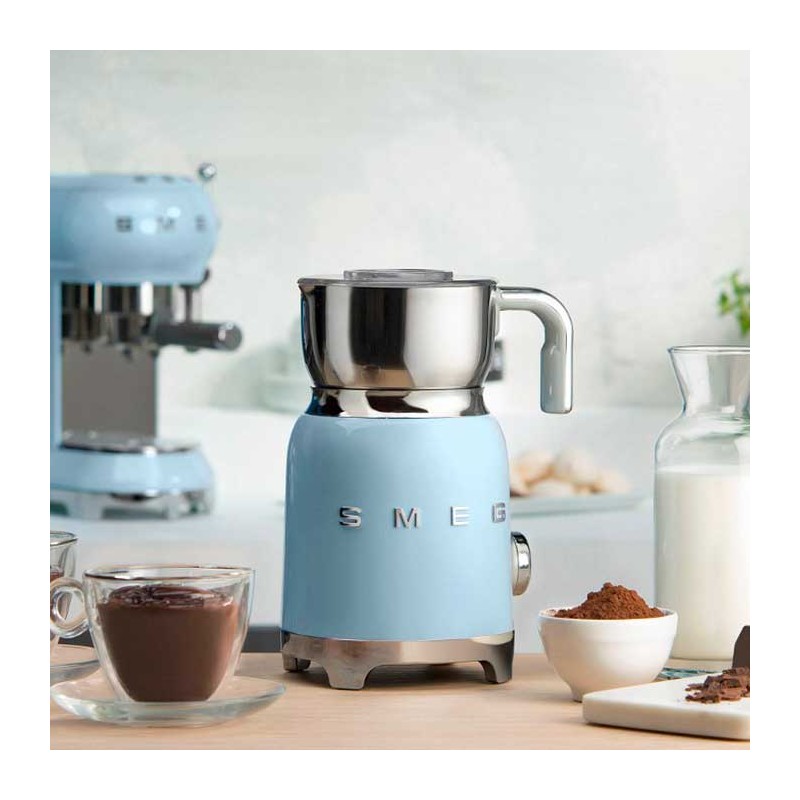 Espumador de leche Smeg 50's Style con cuerpo en acero inoxidable acabado azul cielo brillo y 6 programas para preparar bebidas calientes o frías con o sin espuma.