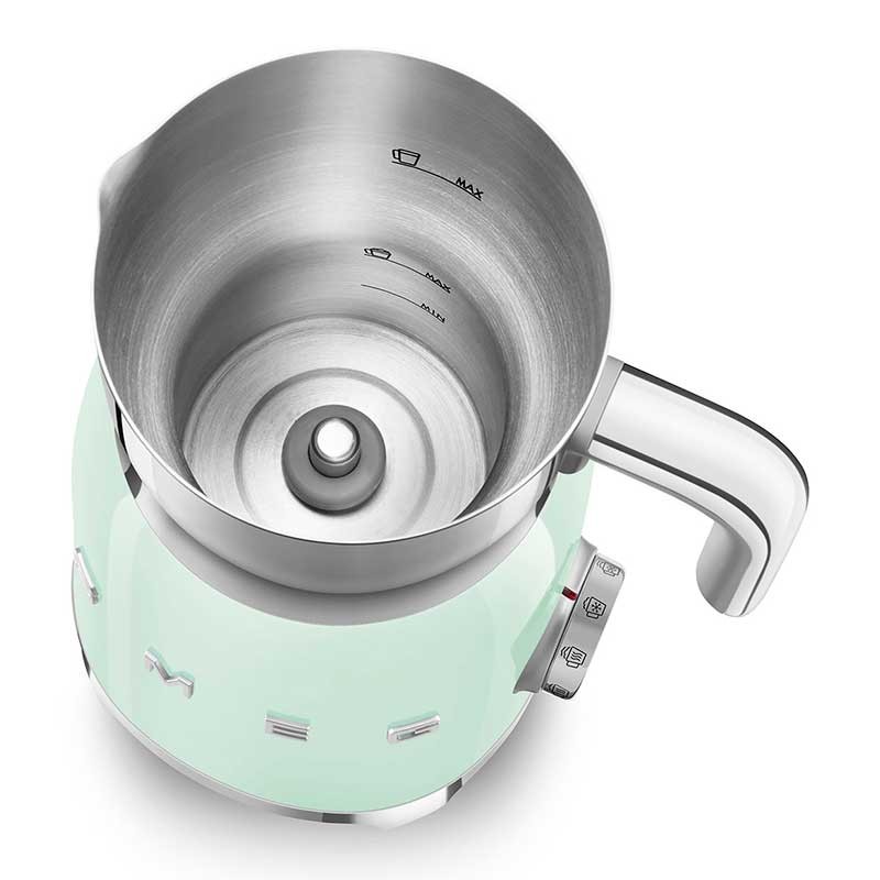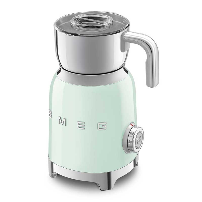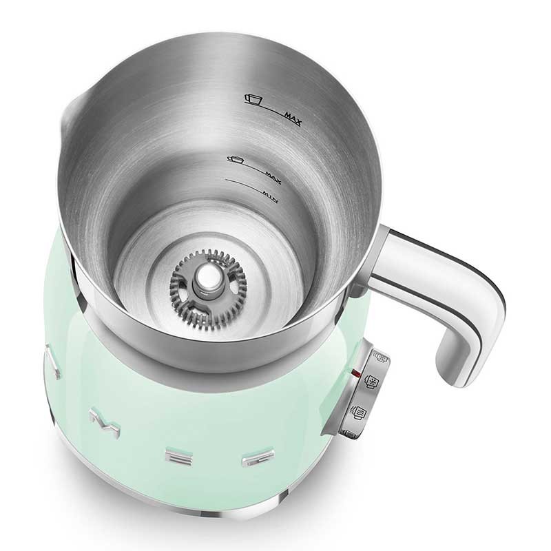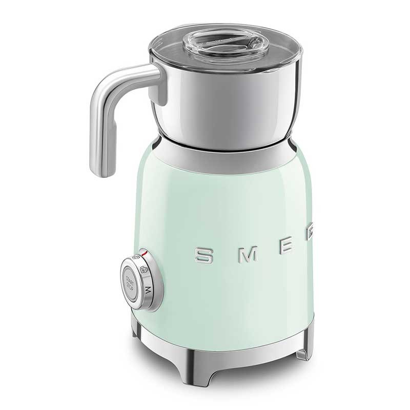 Espumador de leche Smeg 50's Style con cuerpo en acero inoxidable acabado verde agua brillo y 6 programas para preparar bebidas calientes o frías con o sin espuma.
