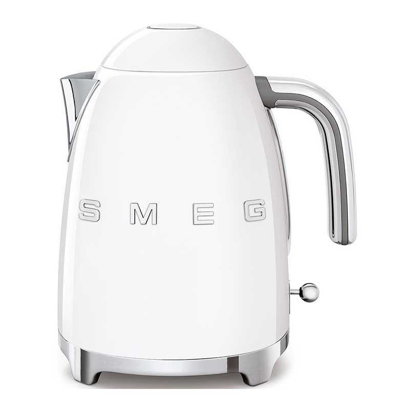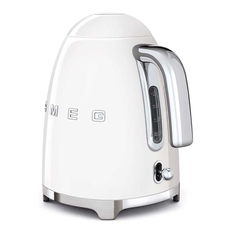 Hervidor estándar Smeg 50's Style de 1,7 litros de capacidad con cuerpo en acero inoxidable acabado blanco brillo y base giratoria 360º.
