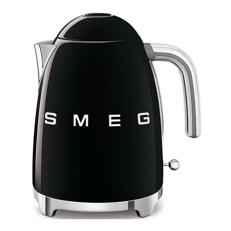 Hervidor estándar Smeg 50's Style de 1,7 litros de capacidad con cuerpo en acero inoxidable acabado negro brillo y base giratoria 360º.