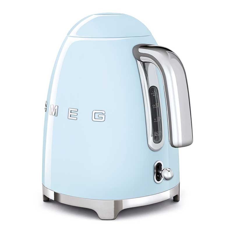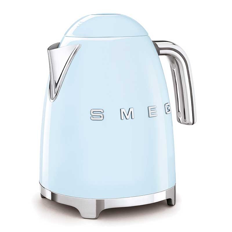 Hervidor estándar Smeg 50's Style de 1,7 litros de capacidad con cuerpo en acero inoxidable acabado azul cielo brillo y base giratoria 360º.