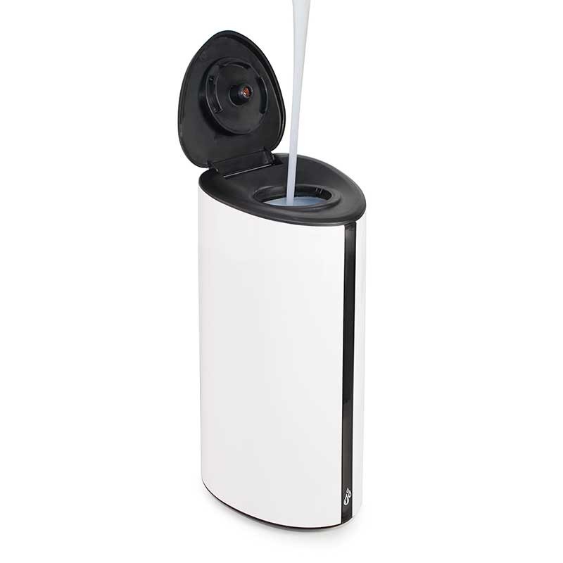 Dispensador automático para jabón o gel hidroalcohólico fabricado en ABS color plata con depósito de polietileno de 850 ml de capacidad.