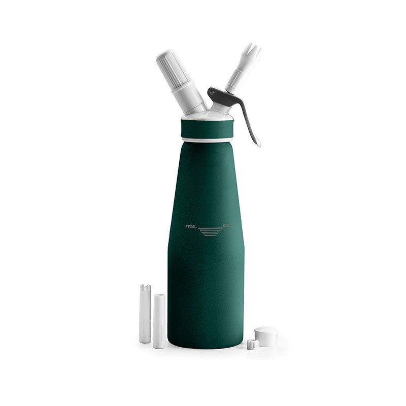 Ampliar Botella sifón de N2O fabricada en aluminio de gran calidad acabado verde. Ideal para realizar espumas, cremas montadas, mouses, etc. Disponible en 2 tamaños.