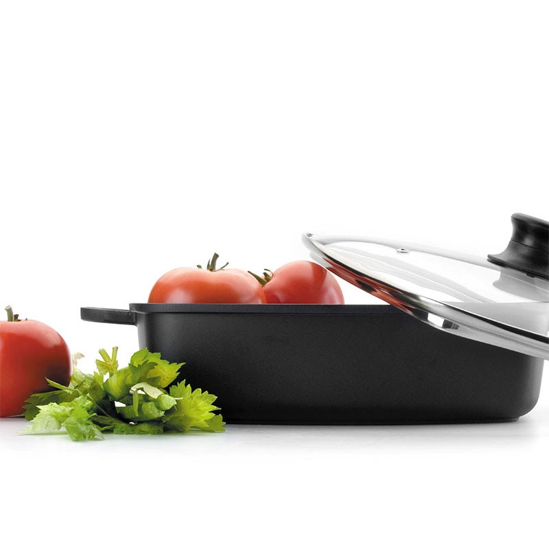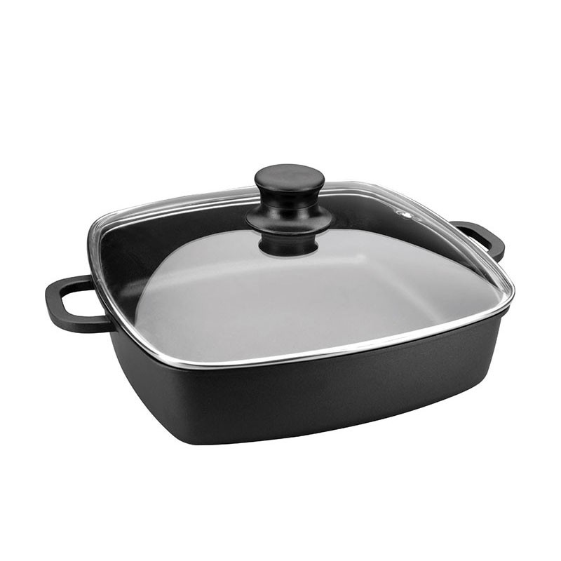 Cacerola baja cuadrada de aluminio fundido antiadherente modelo Forte con tapa de cristal templado, válida para placas de inducción, eléctricas, vitros y cocinas de gas.