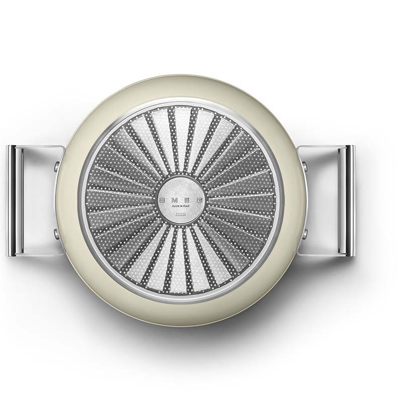 Cacerola antiadherente con tapa Smeg 50's Style de 24 cm de diámetro, cuerpo de aluminio forjado y acabado exterior beige crema mate.