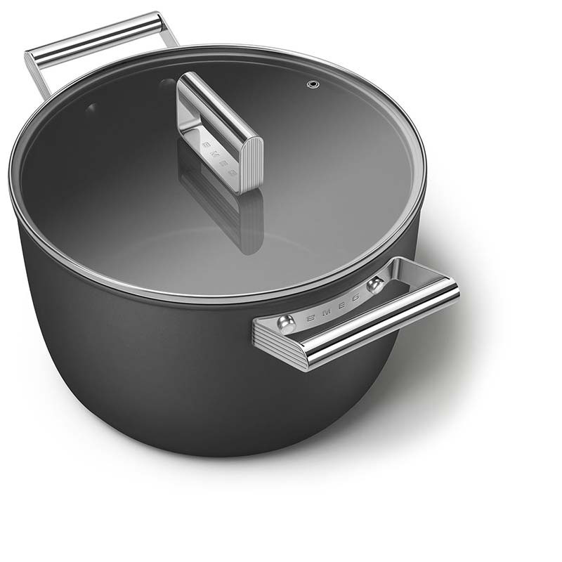Cacerola alta antiadherente con tapa Smeg 50's Style de 26 cm de diámetro, cuerpo de aluminio forjado y acabado exterior negro mate.