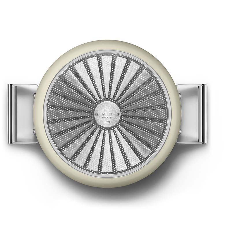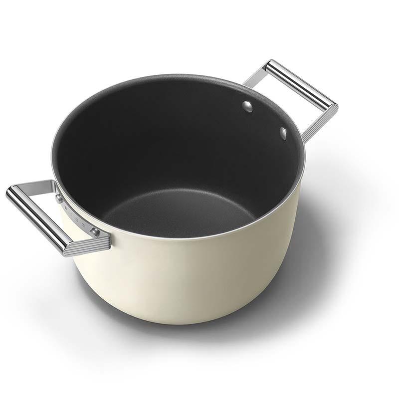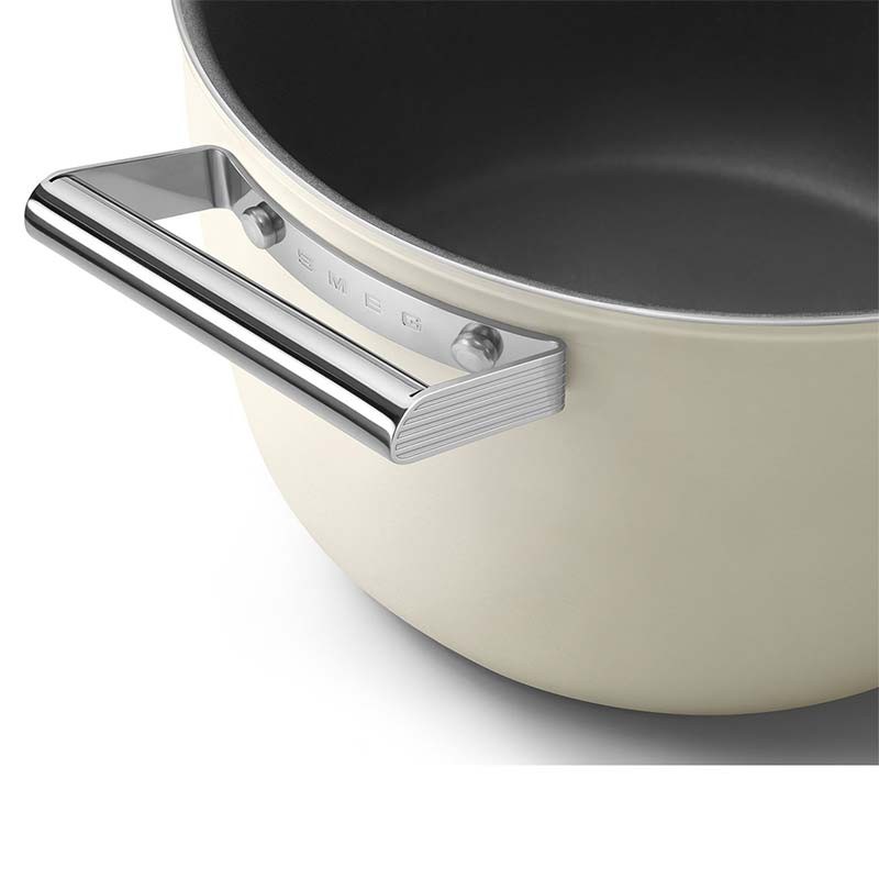 Cacerola alta antiadherente con tapa Smeg 50's Style de 26 cm de diámetro, cuerpo de aluminio forjado y acabado exterior beige crema mate.