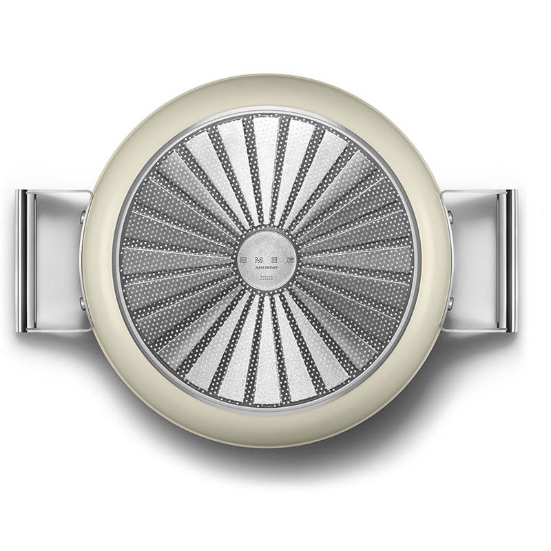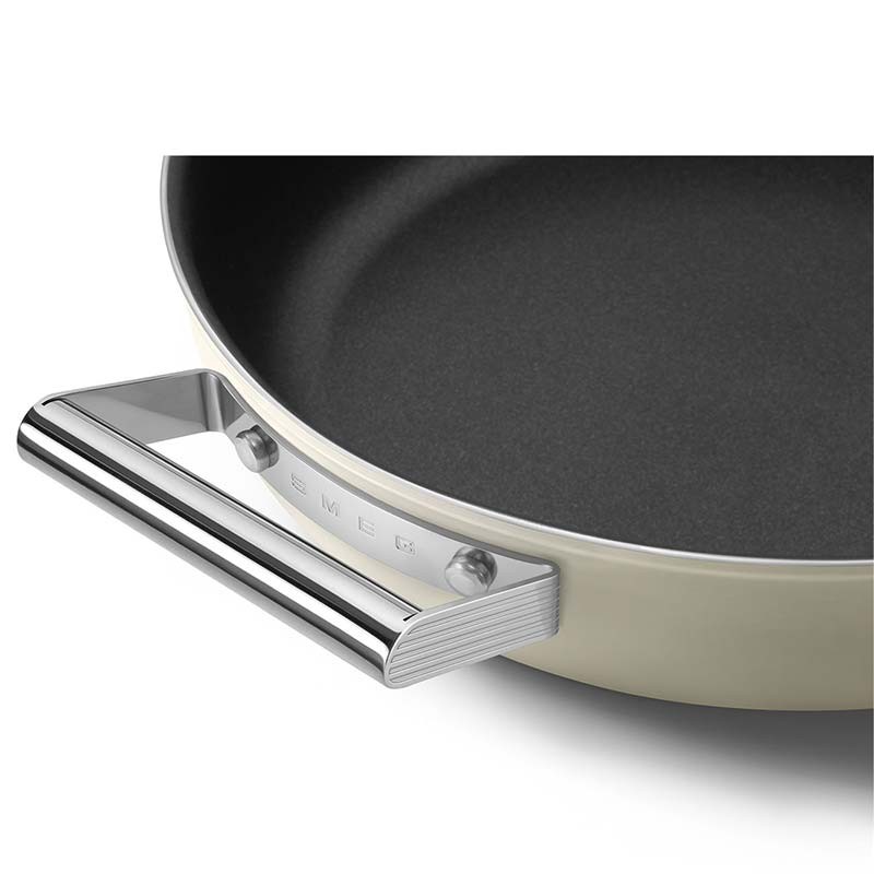 Cacerola baja antiadherente con tapa Smeg 50's Style de 28 cm de diámetro, cuerpo de aluminio forjado y acabado exterior beige crema mate.