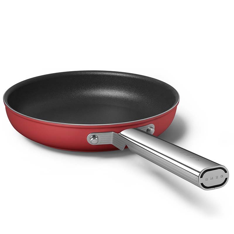 Sartén antiadherente Smeg 50's Style de 24 cm de diámetro, cuerpo de aluminio forjado y acabado exterior rojo mate.