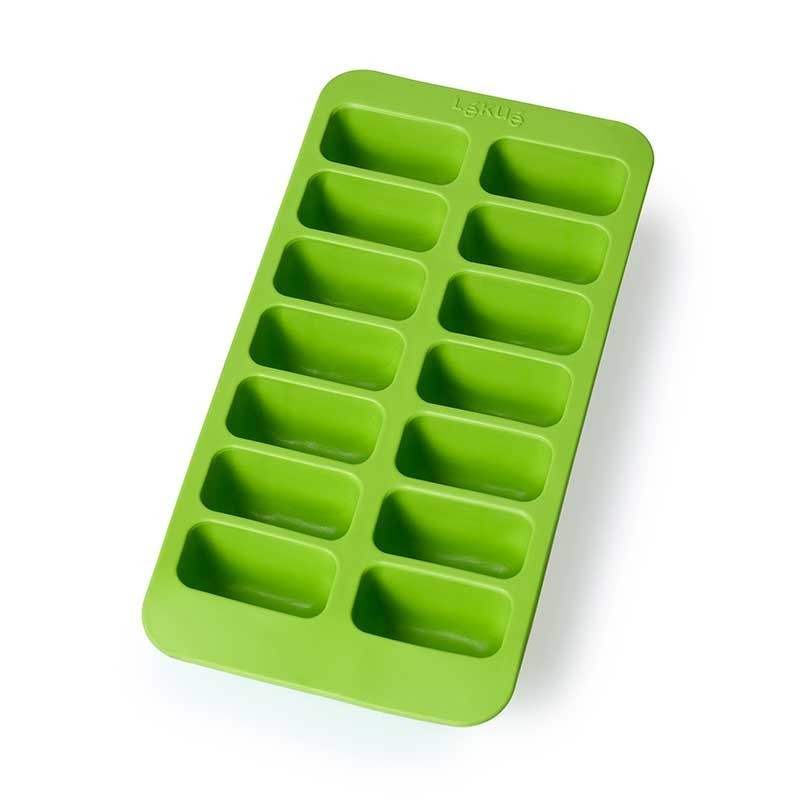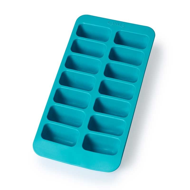 Cubitera de caucho flexible que facilita el desmoldado para hacer 14 cubitos de hielo con forma rectangular.