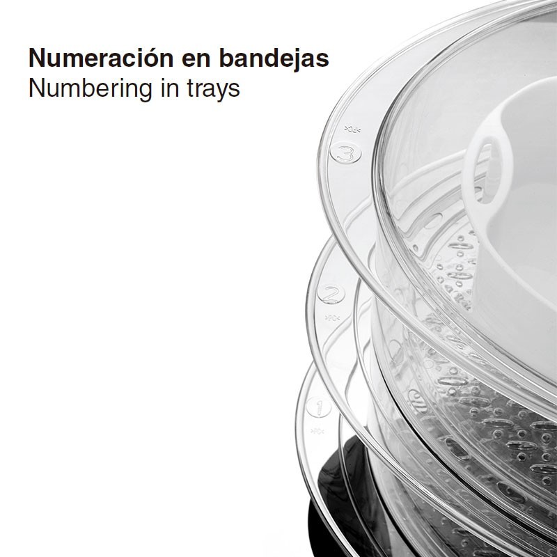 Cocedor eléctrico al vapor de 1000 W de potencia y 12 litros de capacidad fabricado en plástico de uso alimentario libre de bisfenol.