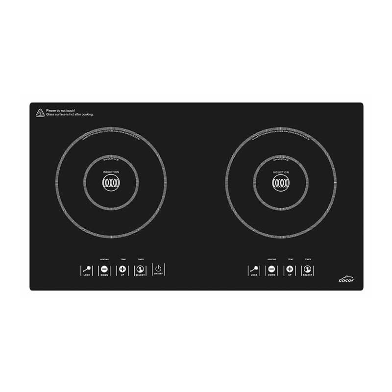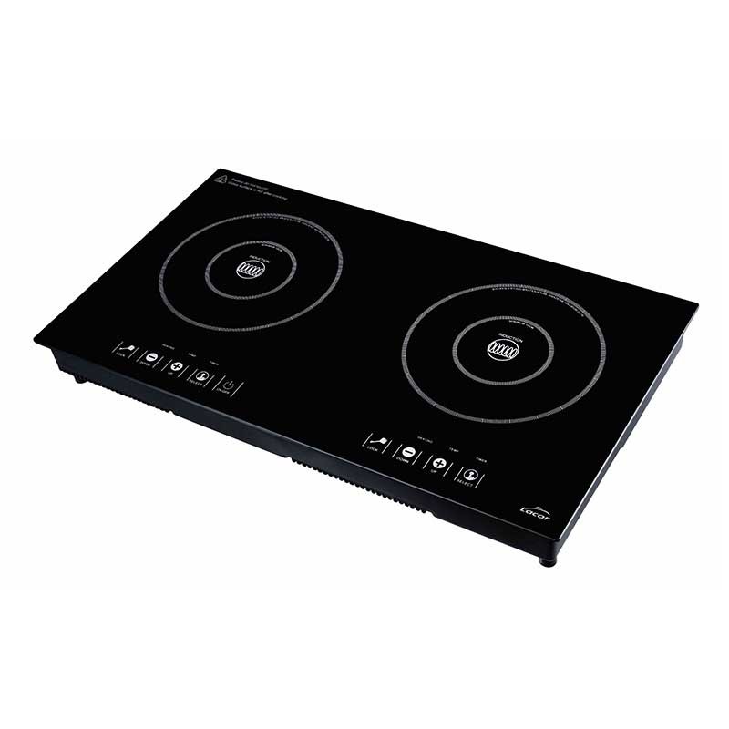 Placa de inducción portátil con 2 zonas de cocinado de 10 a 20 cm de diámetro respectivamente y 7 niveles de potencia con temporizador.