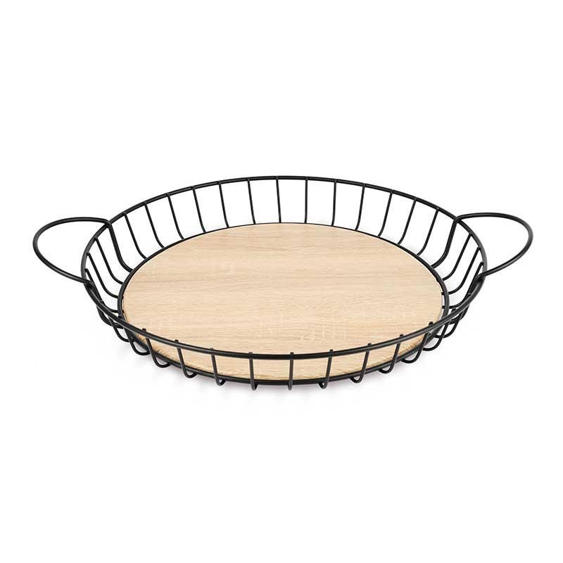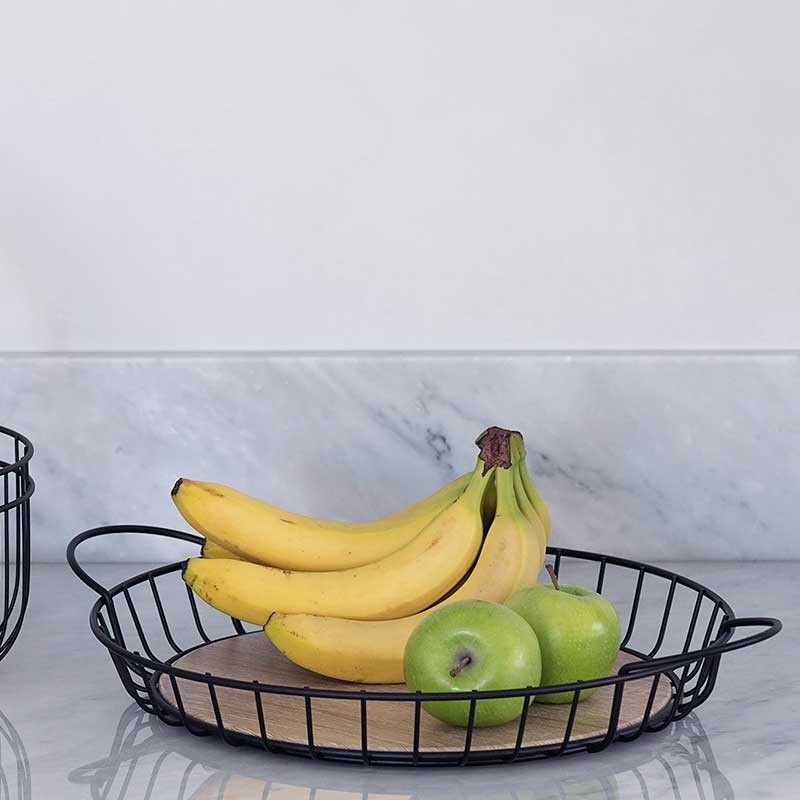 Frutero redondo de 39 cm fabricado en alambre de acero resistente y duradero con un acabado negro mate y un diseño original y decorativo.