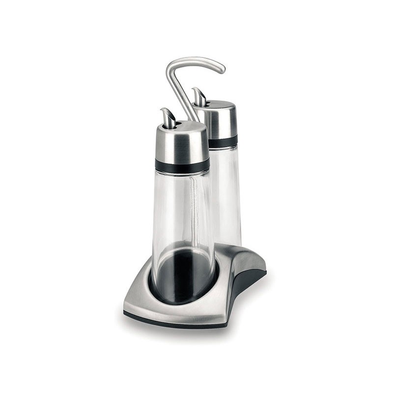 Juego aceitera-vinagrera Serie Luxe de 2 piezas con soporte fabricadas en acero inoxidable 18/10 de gran calidad y resistencia a la corrosión.