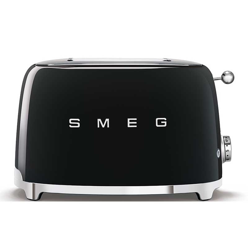 Tostadora Smeg 50's Style con cuerpo en acero inoxidable color negro brillo con 6 niveles de calentamiento y 2 ranuras para 2 tostadas.