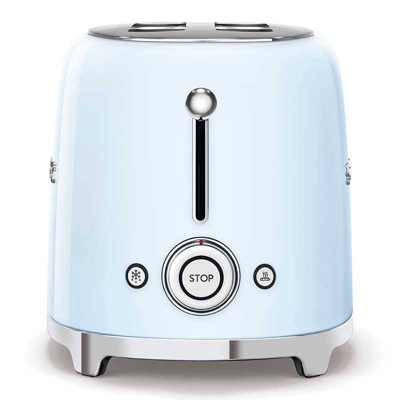 Tostadora Smeg 50's Style con cuerpo en acero inoxidable color azul cielo brillo con 6 niveles de calentamiento y 2 ranuras para 2 tostadas.