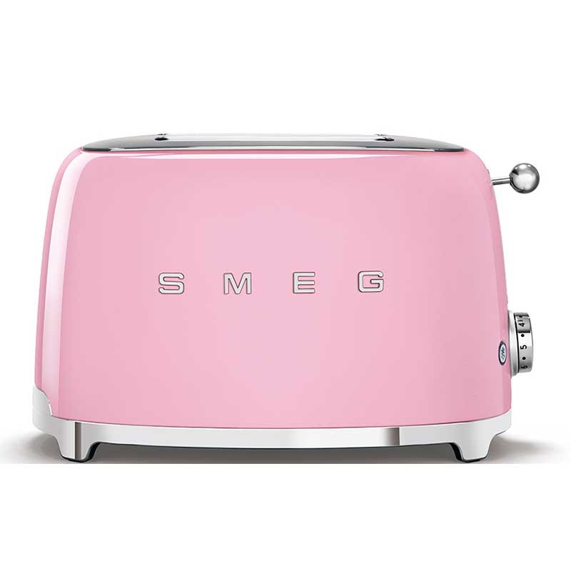 Tostadora Smeg 50's Style con cuerpo en acero inoxidable color rosa brillo con 6 niveles de calentamiento y 2 ranuras para 2 tostadas.
