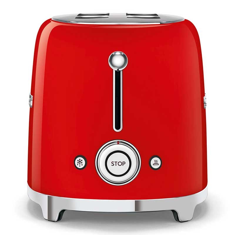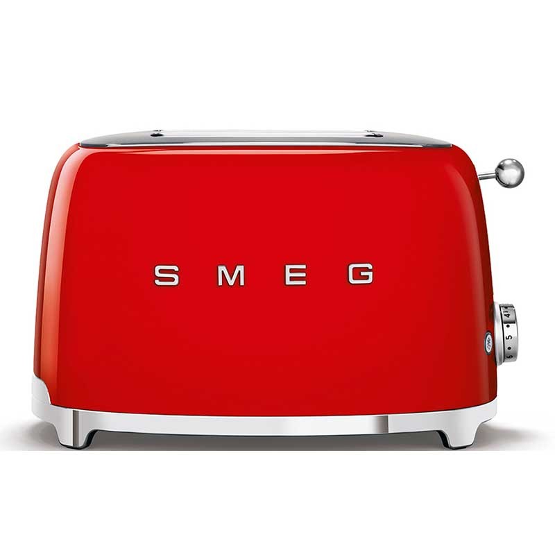Tostadora Smeg 50's Style con cuerpo en acero inoxidable color rojo brillo con 6 niveles de calentamiento y 2 ranuras para 2 tostadas.
