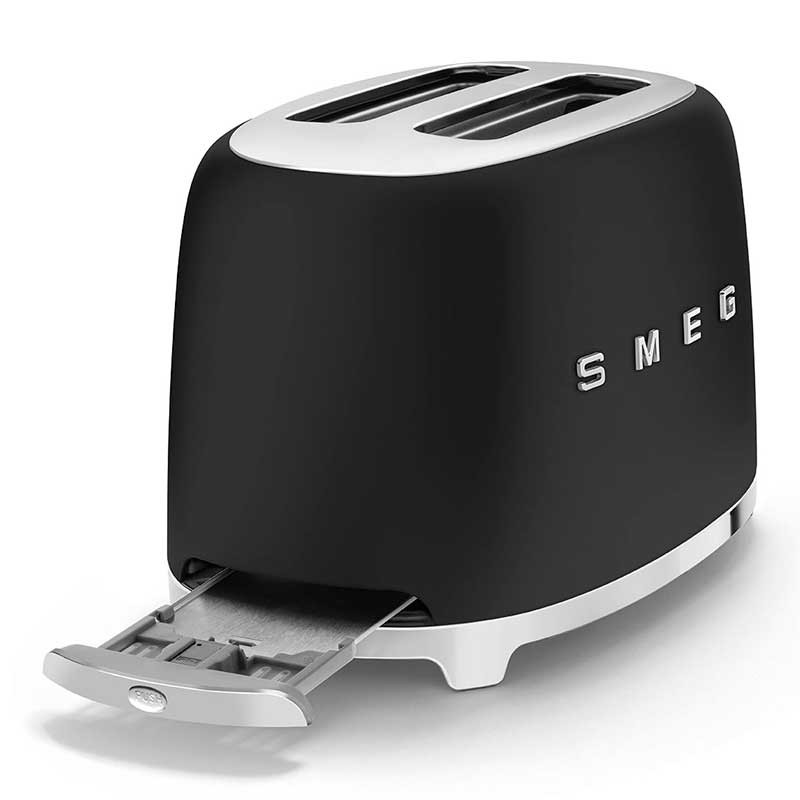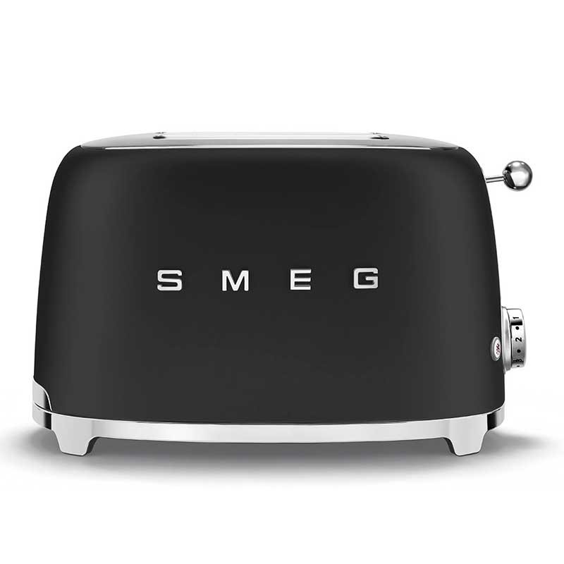Tostadora Smeg 50's Style con cuerpo en acero inoxidable color negro mate con 6 niveles de calentamiento y 2 ranuras para 2 tostadas.