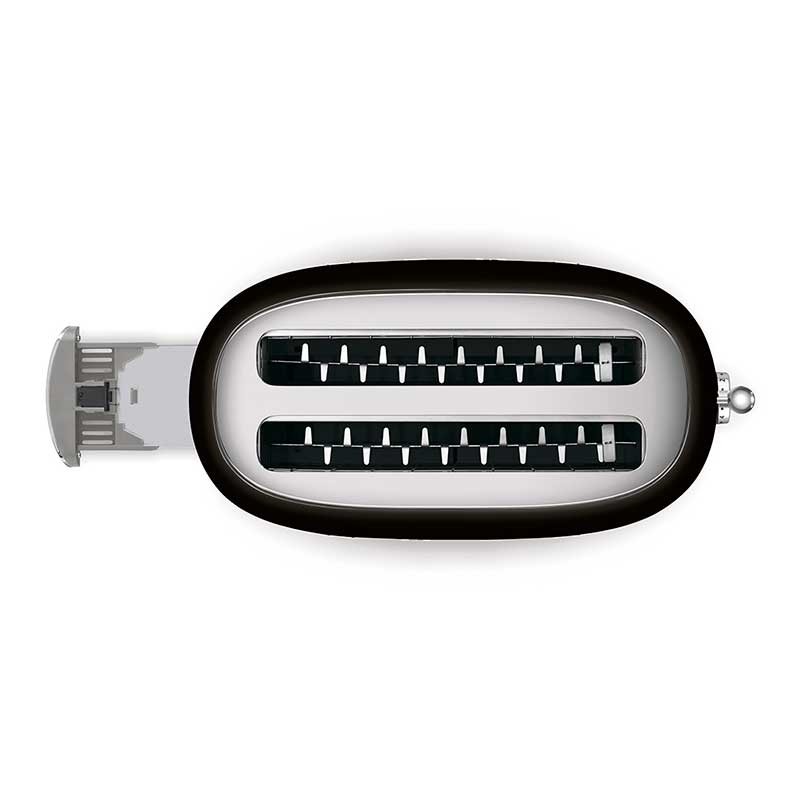 Tostadora Smeg 50's Style con cuerpo en acero inoxidable color negro brillo con 6 niveles de calentamiento y 2 ranuras para 4 tostadas.