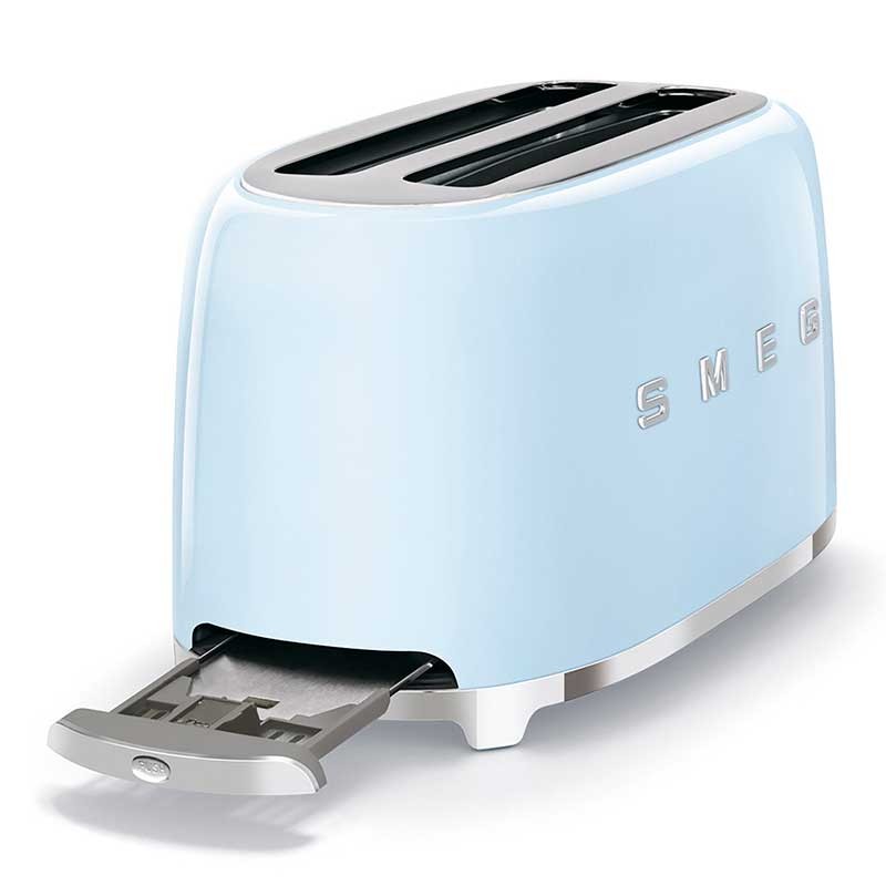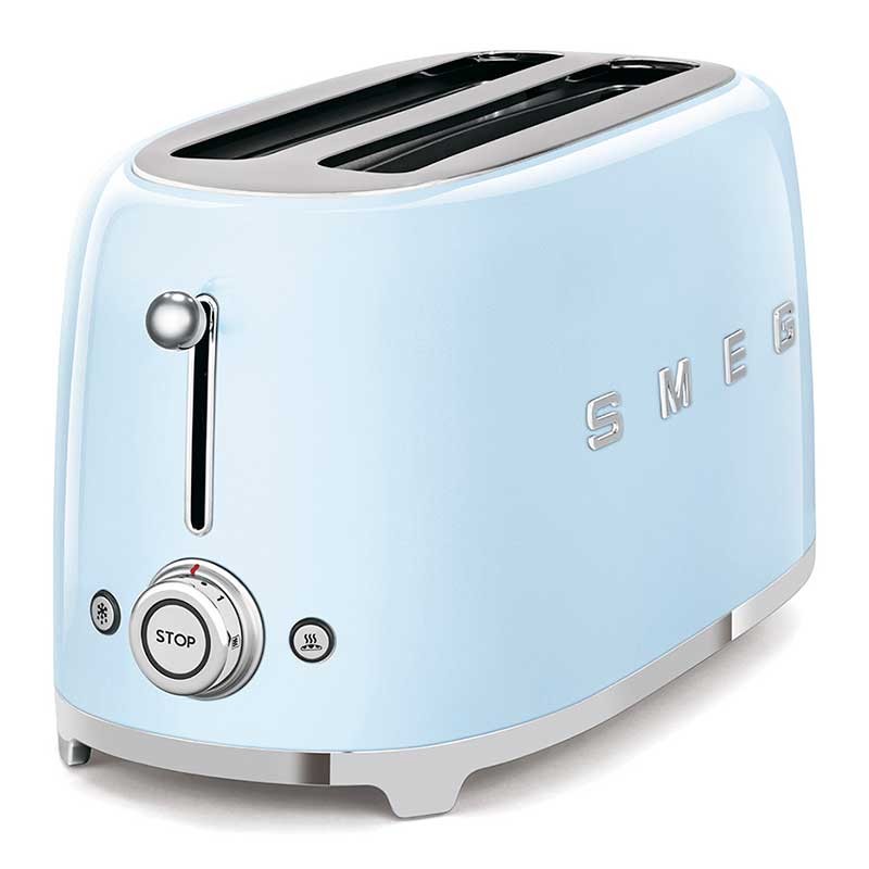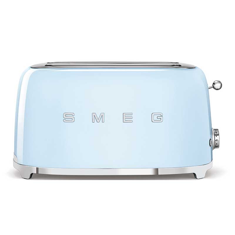 Tostadora Smeg 50's Style con cuerpo en acero inoxidable color azul cielo brillo con 6 niveles de calentamiento y 2 ranuras para 4 tostadas.