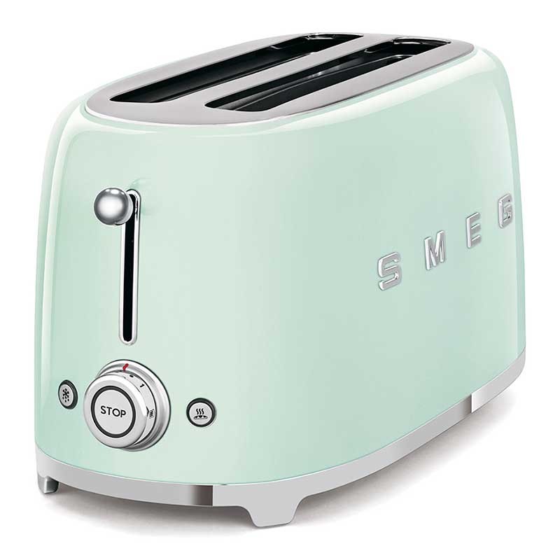 Tostadora Smeg 50's Style con cuerpo en acero inoxidable color verde agua brillo con 6 niveles de calentamiento y 2 ranuras para 4 tostadas.