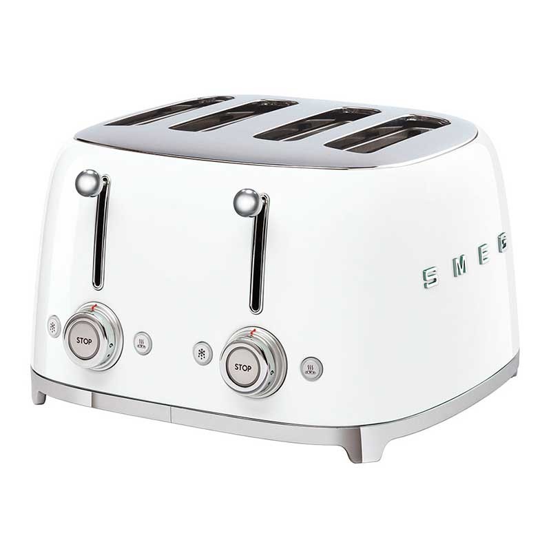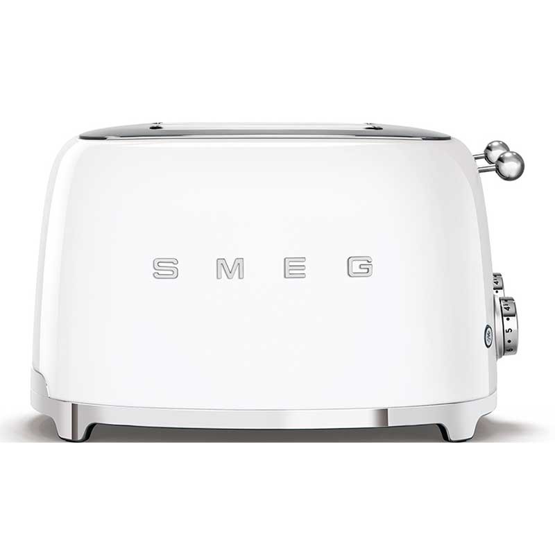 Tostadora Smeg 50's Style con cuerpo en acero inoxidable color blanco brillo con 6 niveles de calentamiento y 4 ranuras para 4 tostadas.