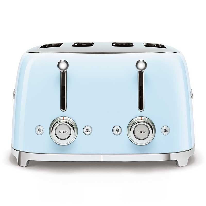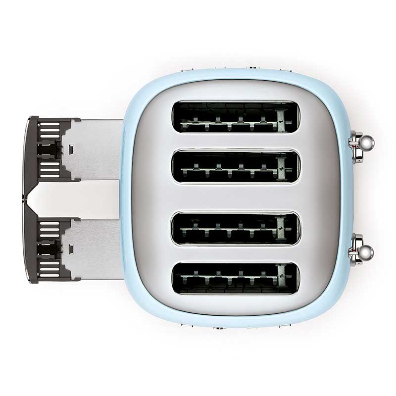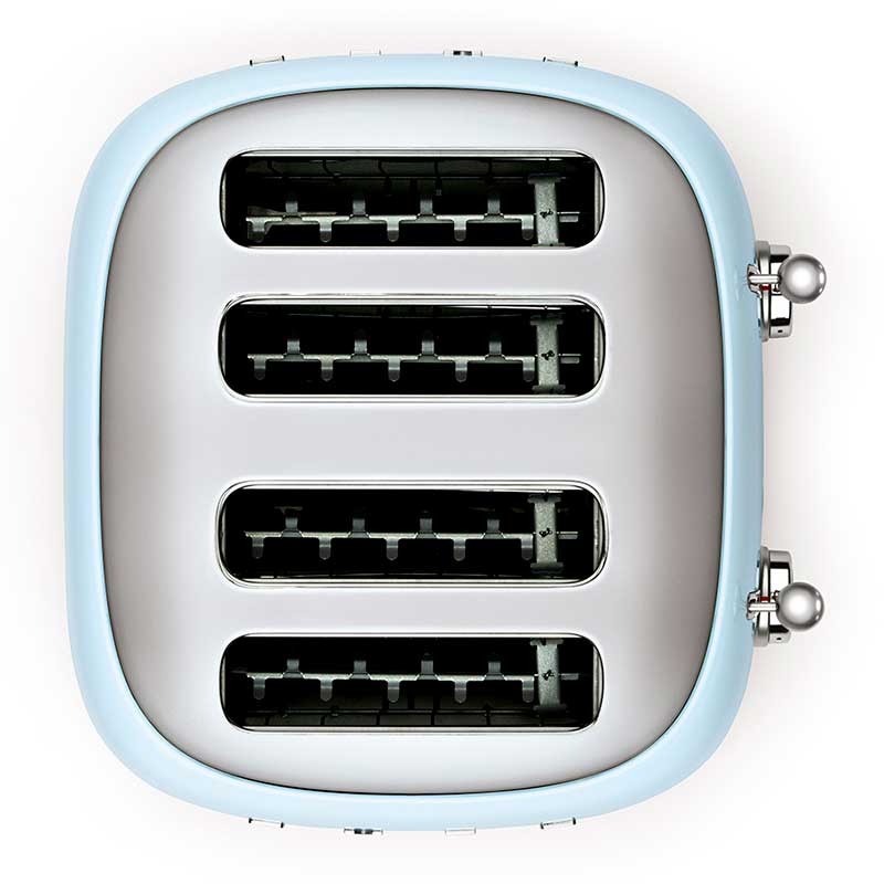 Tostadora Smeg 50's Style con cuerpo en acero inoxidable color azul cielo brillo con 6 niveles de calentamiento y 4 ranuras para 4 tostadas.