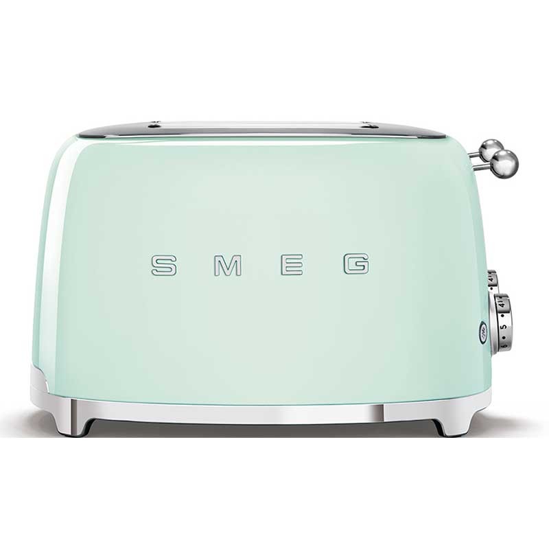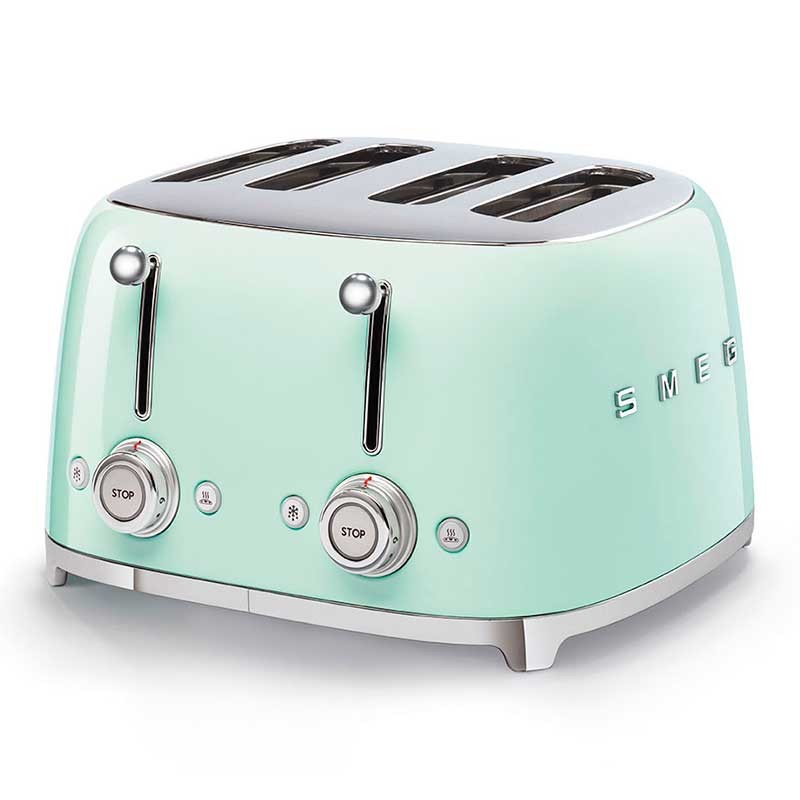 Tostadora Smeg 50's Style con cuerpo en acero inoxidable color verde agua brillo con 6 niveles de calentamiento y 4 ranuras para 4 tostadas.