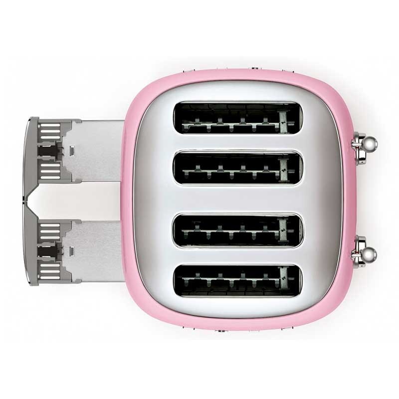 Tostadora Smeg 50's Style con cuerpo en acero inoxidable color rosa brillo con 6 niveles de calentamiento y 4 ranuras para 4 tostadas.