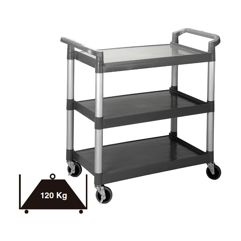 Ampliar Carro de servicio de cocina fabricado en polietileno de gran resistencia con 3 bandejas para cargar hasta 120 kg de peso. Ideal para hostelería y caterings.